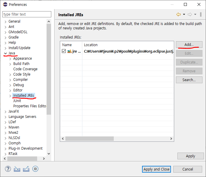 Java -> Installed JREs -> [Add...] 버튼 클릭
