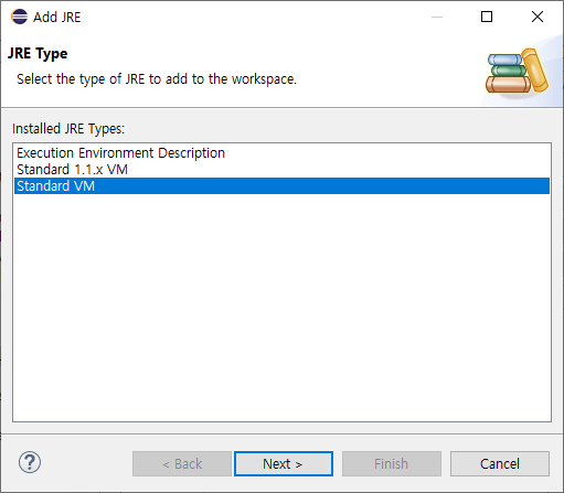 3. JRE Type: Standard VM 선택 -> [Next] 버튼 클릭