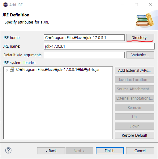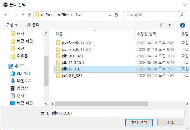 5. 폴더 선택: Program Files > Java 에서 jdk-17을 선택한다.