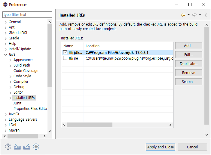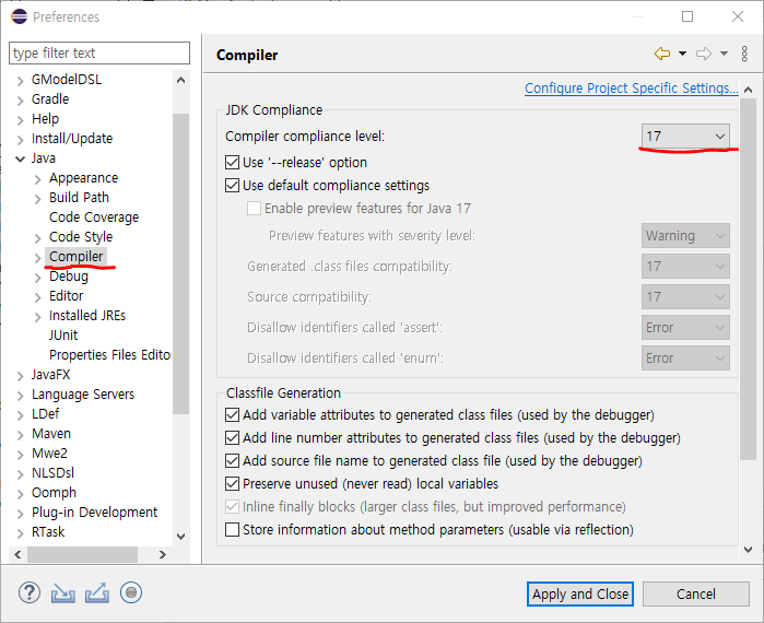 7. Installed JREs: Compiler 선택 -> Compiler compliance leve: 17 선택